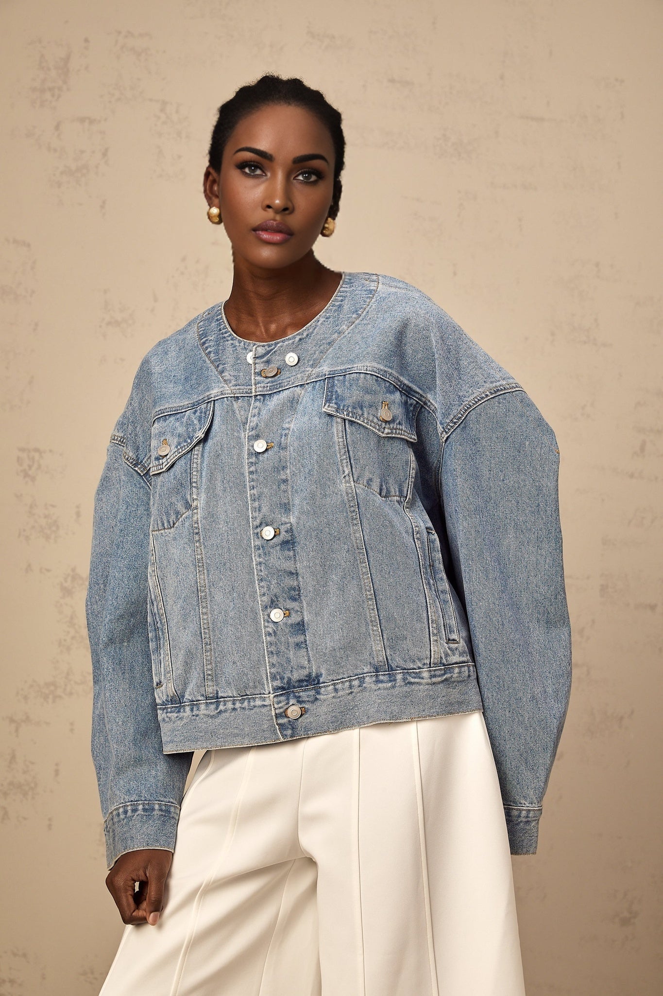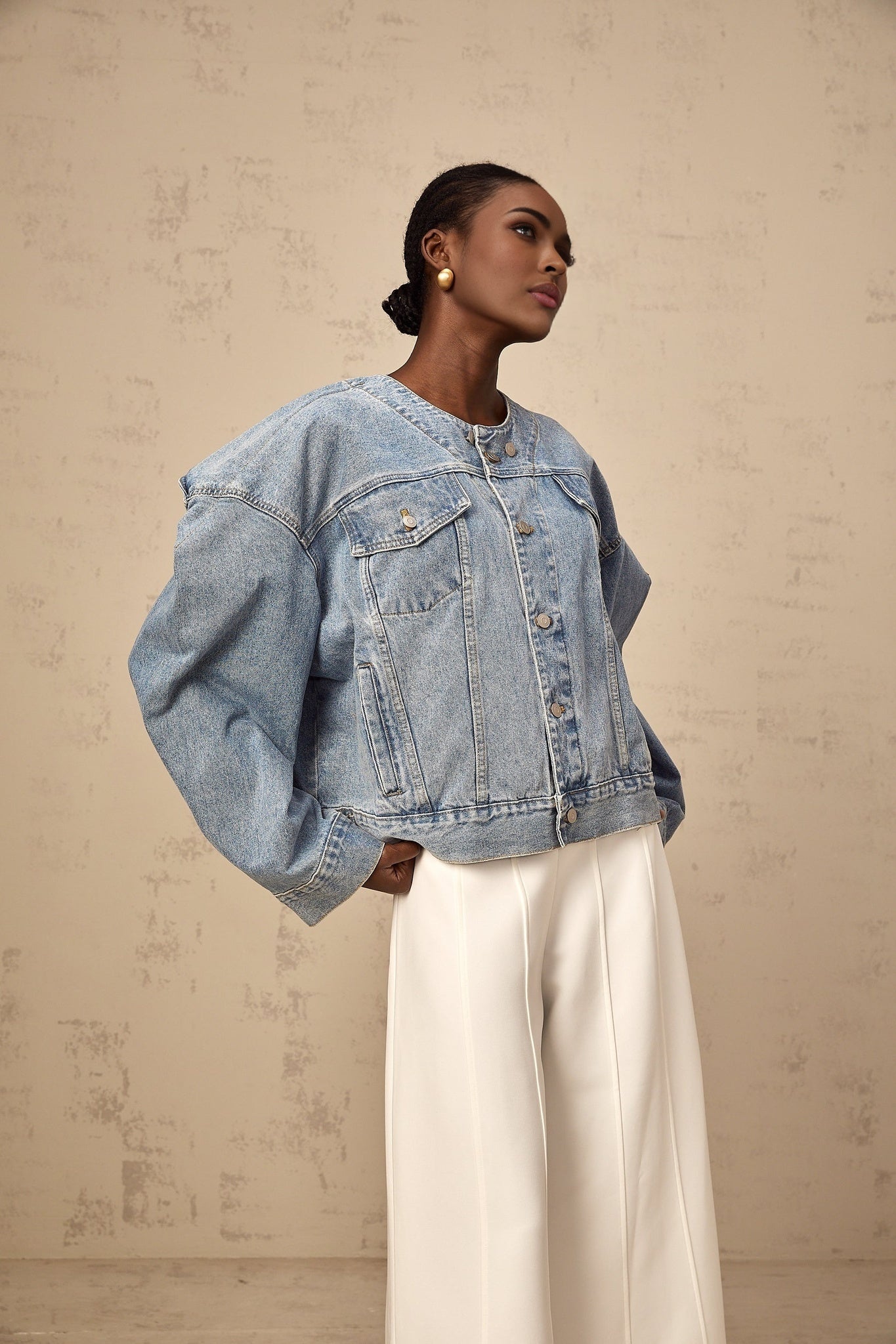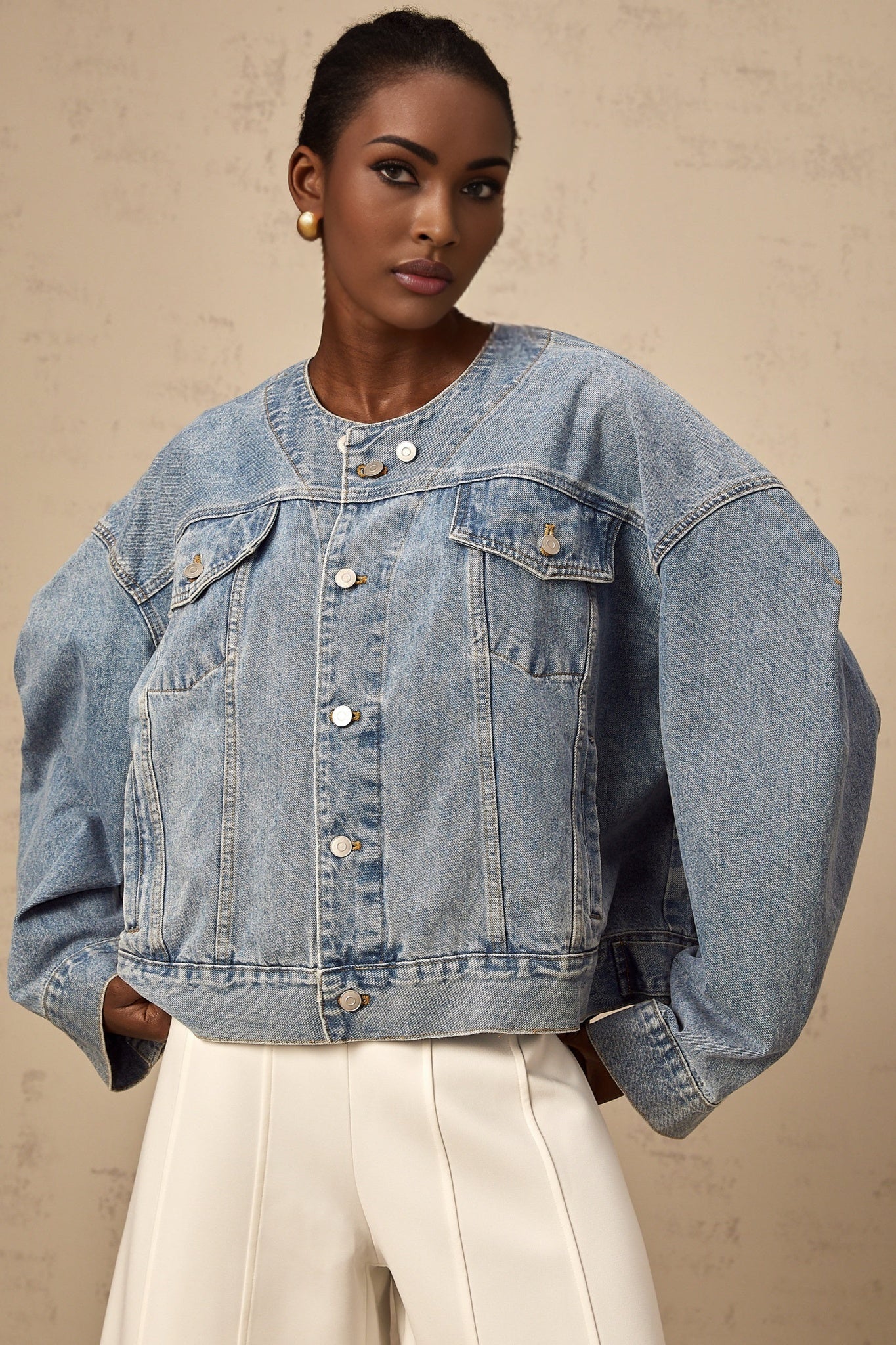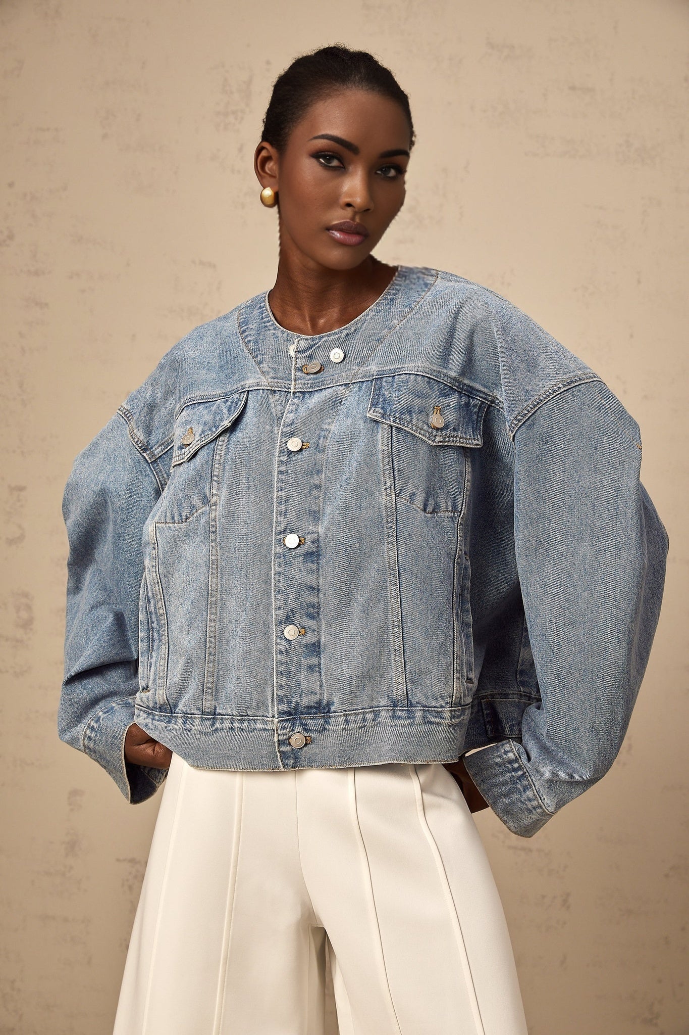 Concetta Jeansjacke Blau Kragenlos Mit Knöpfen Und Taschen