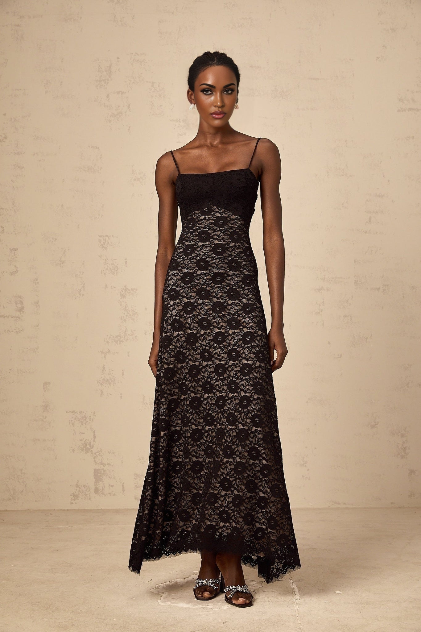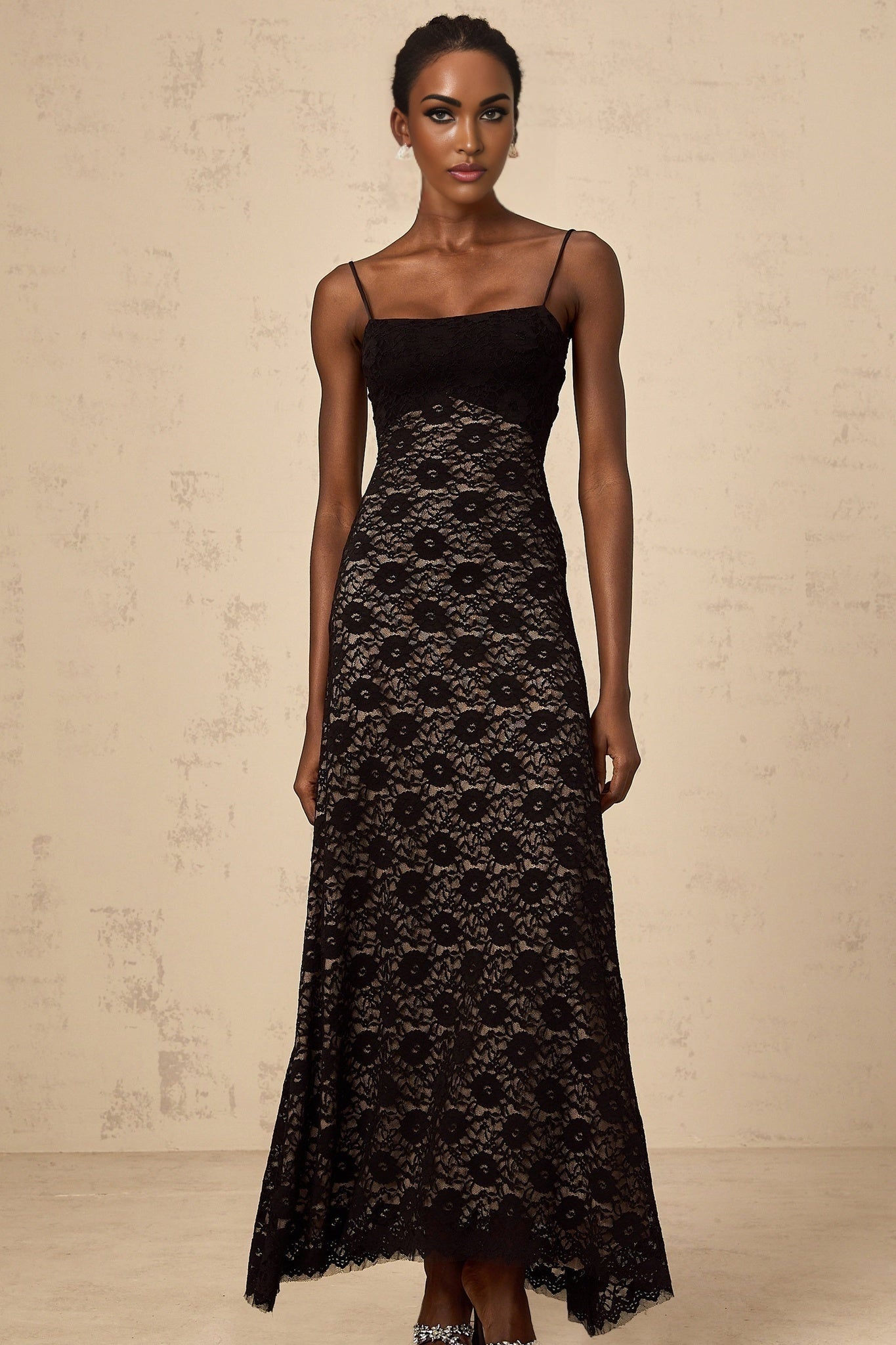 April Blumen Maxikleid: ärmellos, quadratischer Ausschnitt, offener Rücken, schwarze Spitze