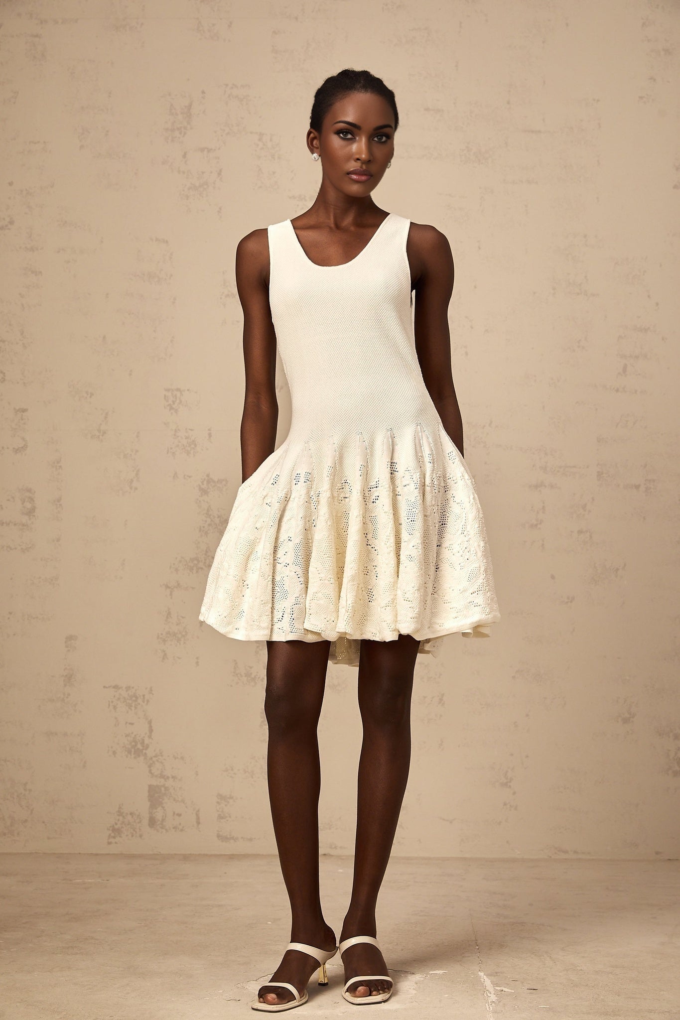 Presley Minikleid Elfenbein Weiß Jacquard Strick Flare Saum