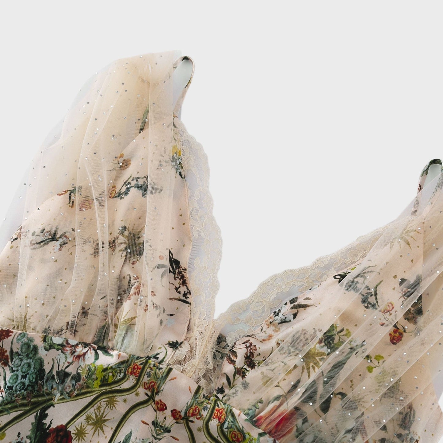 Chloe Maxikleid - Weißes Blumenmuster mit tiefem V-Ausschnitt, Ballonärmeln & gerüschtem Saum